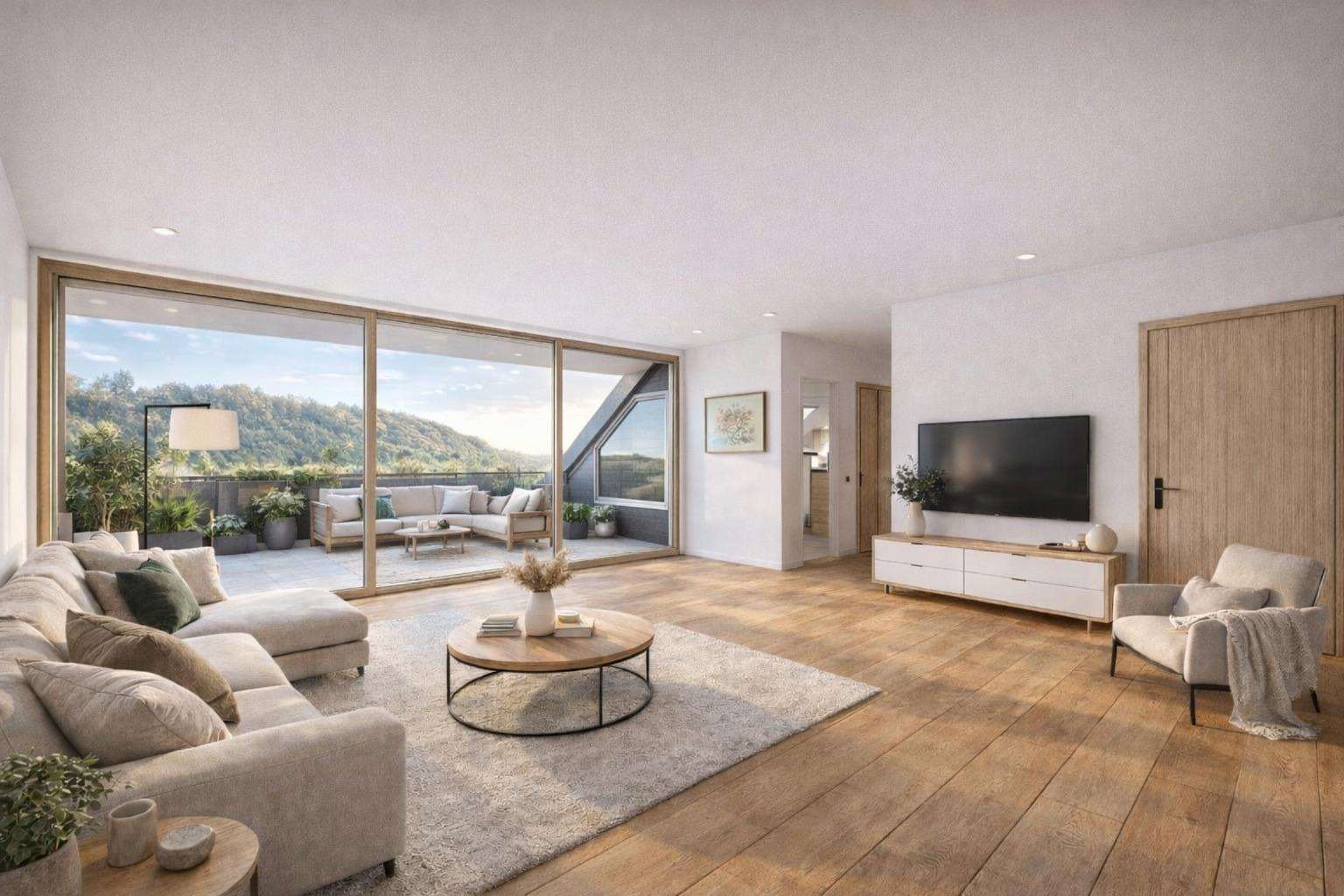 Vom großzügigen Wohnzimmer mit Zugang zur Südwest-Loggia genießen Sie einen traumhaften Blick ins Grüne.