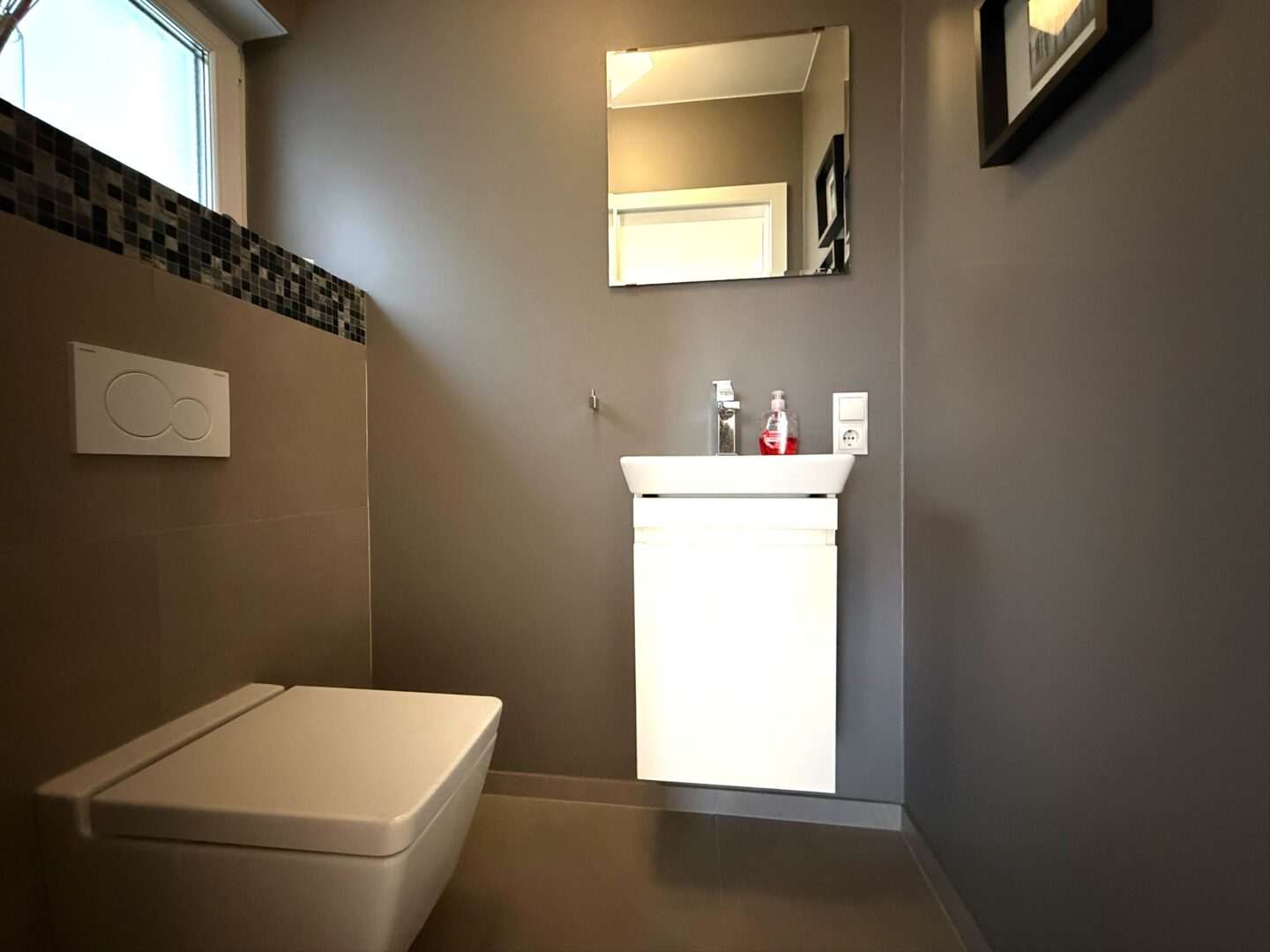 Das Badezimmer verfügt über eine stilvolle Einrichtung und eine komfortable Dusche.und Wanne. Genießen Sie die Annehmlichkeiten eines eigenen Balkons, auf dem Sie entspannte Stunden im Freien verbringen können.